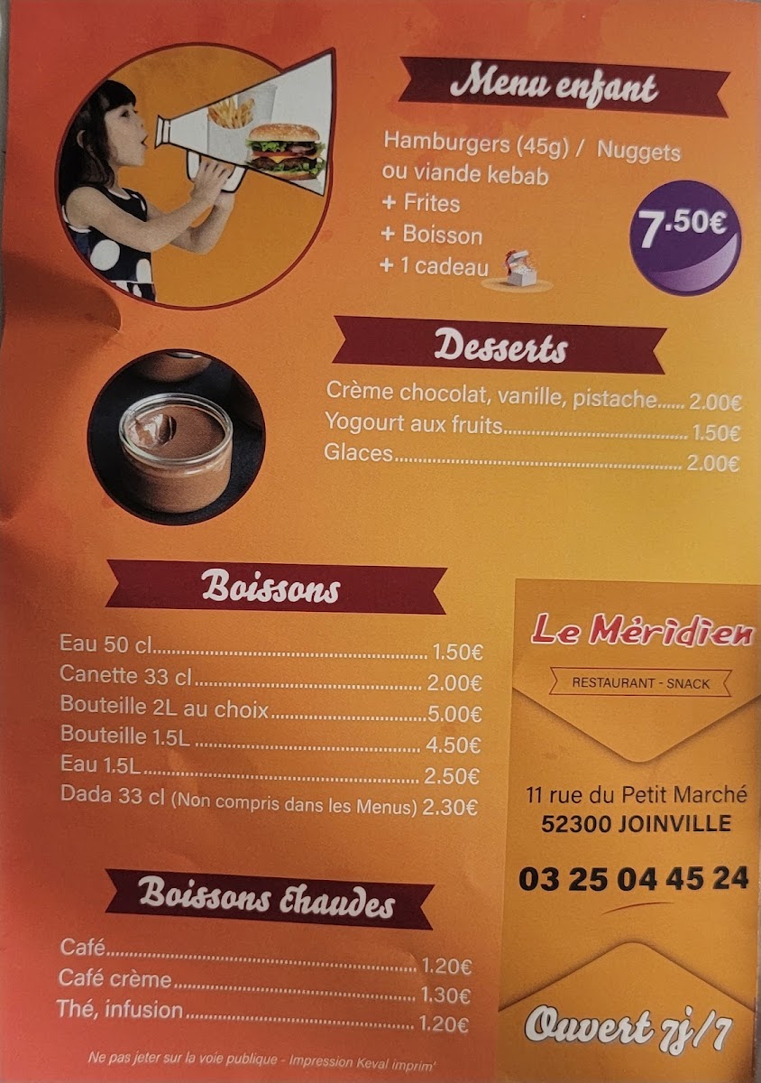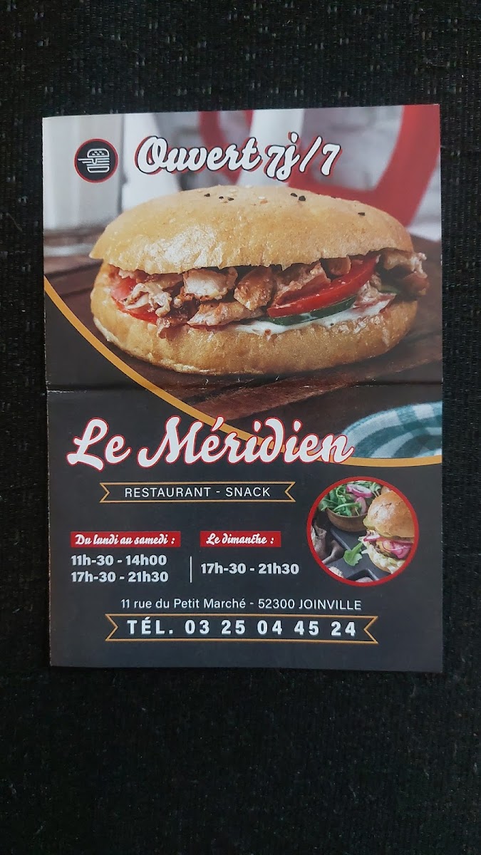 Welcome to Le Méridien, a delightful fast food restaurant nestled in the heart of Joinville, France. Located at 11 Rue du Petit Marché, this eatery is renowned for its mouthwatering menu that promises to satisfy any craving.